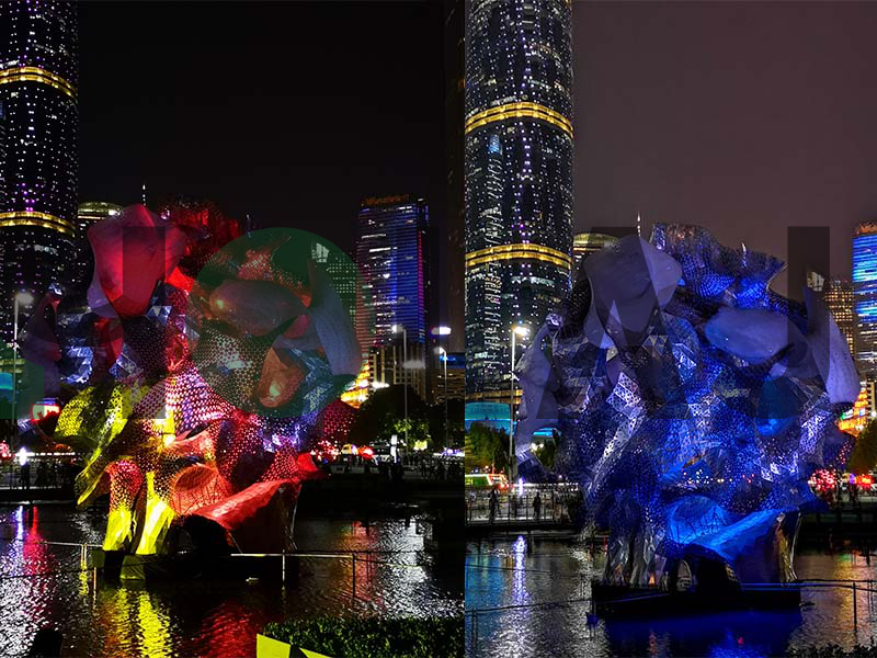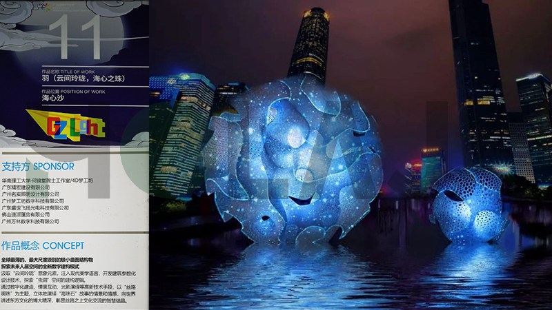 2019年11月18日,廣州國際燈光節正式亮燈。今年的燈光節在立意上充分詮釋了“國潮正當紅”。海心沙會場的主題為“國潮”,作品《五音之空》正取材于中國傳統五音——“宮商角徵羽”。“羽”采用兩組燈光作品《云間玲瓏,海心之珠》、《木棉花開,英雄之城》,分別從“水”鬼斧神工般的雕琢出海心之珠,到“水”潤物無聲的滋養出花城花開,展示羽音的豐富內韻。。