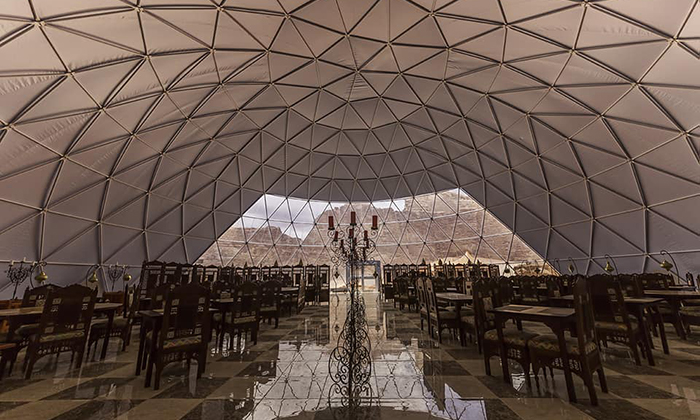 好來居球形篷房采用的是球面網殼架構, 網殼是一種曲面型空間網格結構,兼具網架結構和薄殼結構的特點,用材省,但受力性能相當好,安全系數極高,而且外形美觀、富于變化。曾被譽為“空間強,重量輕,有效果的設計” !球形篷房更具安全性、實用性和經濟效益,結構穩固、可抗風雪防震、抗風能力可達120km/hr,安全性完全可以抵御自然災害,而且還有多種規格可供選擇。
