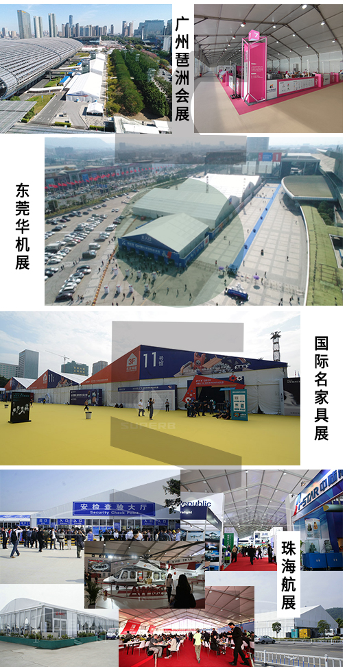 我司嚴(yán)格執(zhí)行ISO9001的質(zhì)量管理體系,確保不良產(chǎn)品的最小化及客戶滿意度的最大化。我們的的主要產(chǎn)品包括可移動的模塊化鋁合金支架篷房,有不同風(fēng)格的篷房及裝飾可供選擇,篷房跨度從3米到60米。此外,還包括錐頂篷房和吊頂篷房,以及篷房配件,如照明燈具、地板、空調(diào)、桌椅及其它用于篷房內(nèi)部的家具。篷房可廣泛應(yīng)用于大小型活動、婚慶、展會、體育、酒店、航空和工業(yè)等其它領(lǐng)域。篷房框架結(jié)構(gòu)為高強度鋁合金6061/T6型材,篷布為防水、阻燃的雙面PVC涂層聚酯纖維布,主體結(jié)構(gòu)風(fēng)載荷不少于100Km/h。